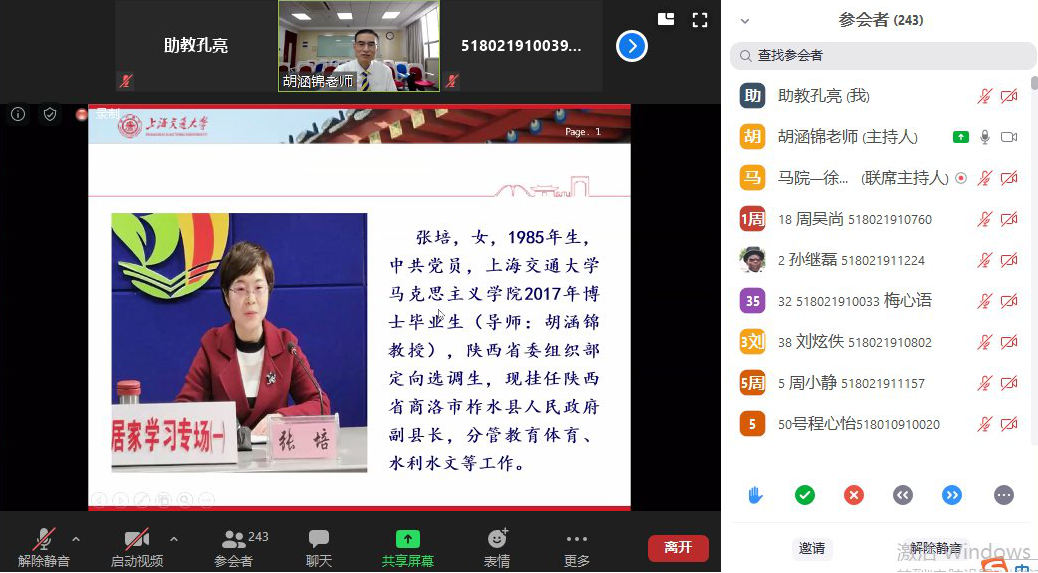 优秀博士毕业生、现挂职陕西省商洛市柞水县副县长张培“走进”在线直播课堂。张培以“全面小康路上的柞水实践”为题,向同学们生动讲述了她所在的国家级贫困县以“小木耳大产业”实现脱贫摘帽的精彩故事。