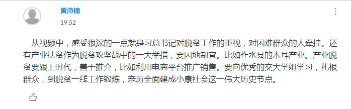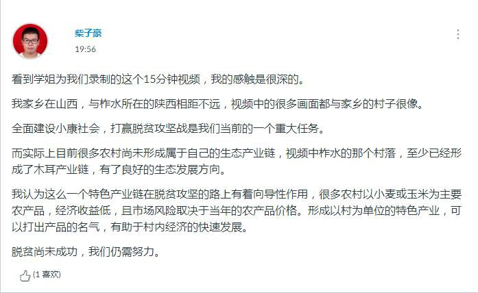 张培的娓娓道来让身处天南海北的同学们为学姐所在柞水县取得的成绩感到激动和感动。15分钟的视频讲述虽然短暂,但大家从柞水故事中感受到了基层干部和民众对坚决打赢脱贫攻坚战的决心与信心,也对以习近平同志为核心的党中央团结带领全国各族人民攻坚克难,实现全面建成小康社会充满信心。