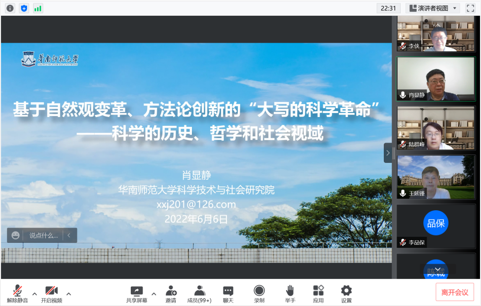 6月6日下午,澳门六合彩下注平台 邀请华南师范大学特聘教授肖显静做客思源讲堂第十四期,为广大师生带来“基于自然观变革、方法论创新的‘大写的科学革命’”的线上讲座。讲座由澳门六合彩下注平台 科学技术哲学·科技与社会(STS)学科团队承办,科学史与科学文化研究院院长李侠教授主持,校内外150余名师生共同在线学习讨论。
