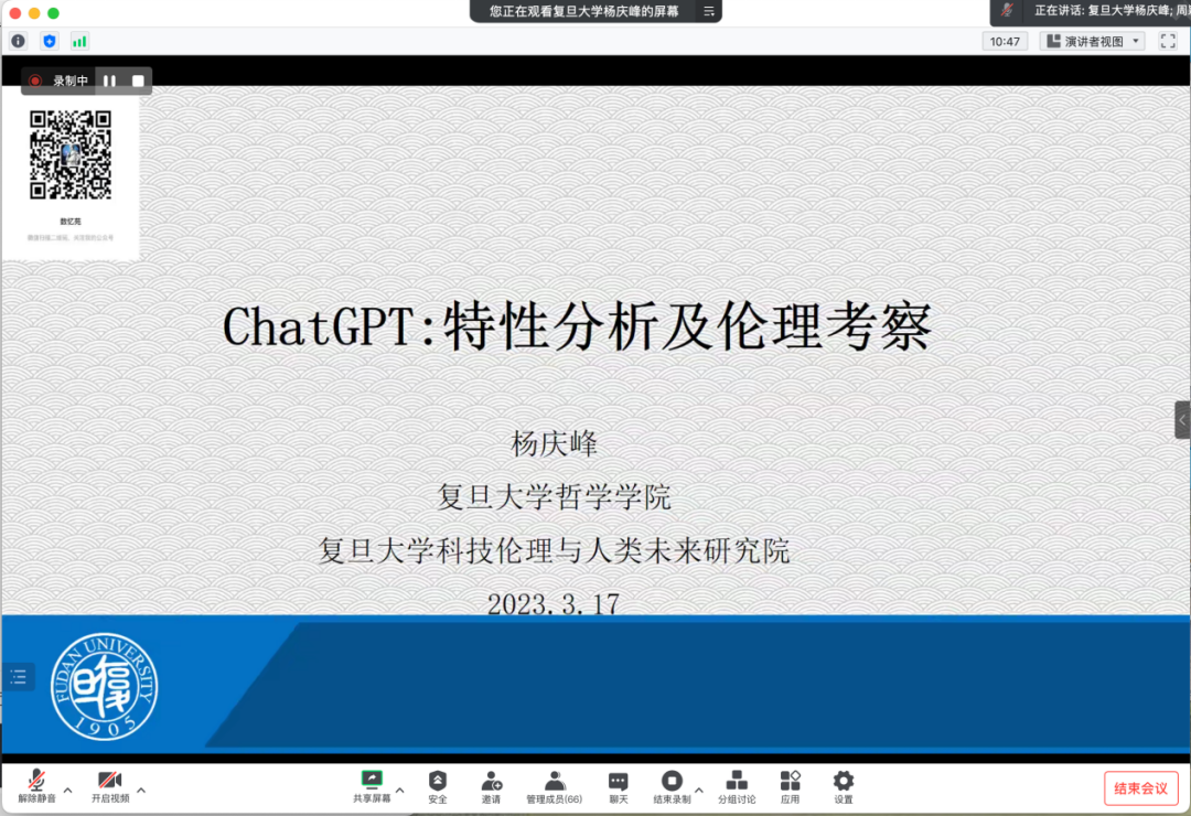 3月17日,澳门六合彩下注平台 邀请中国科协-复旦大学科技伦理与人类未来研究院杨庆峰教授作客致远讲座第十八期,为广大师生带来主题为“ChatGPT:特性及其伦理考察”的学术报告。本次讲座由澳门六合彩下注平台 科学技术哲学学科团队、技术史与人来未来学科团队承办,陆群峰副教授担任本次讲座的主持人,闫宏秀教授担任评议人。校内外师生共一百余人参加了本次讲座,共同交流学习。