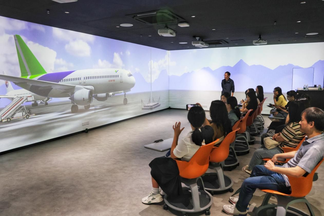 在二楼环幕展厅,教师们裸眼感受了14k三面环绕大屏的全景式体验,C919大飞机、外滩风云等思政资源的动态展播融合了视觉、听觉、触觉等多种感官体验,让教师们身临其境地感受。