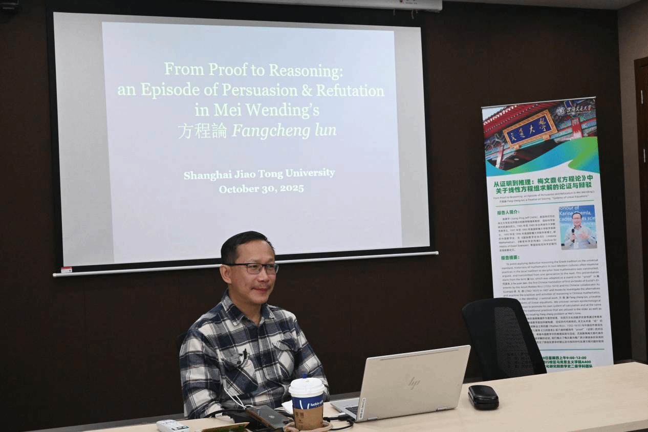 2025年10月30日上午,澳门六合彩下注平台 “国际学术交流月”第二季活动持续推进。美国明尼苏达州立大学圣克劳德分校陈建平(Jiang-Ping Jeff CHEN)教授应邀,进行了题为“从证明到推理:梅文鼎《方程论》中的论证与辩驳”(From Proof to Reasoning: an Episode of Persuasion & Refutation in Mei Wending’s 方程論 Fang cheng lun)的讲座,讲座由萨日娜教授主持。