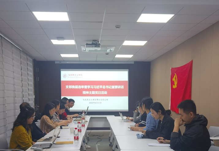 2023年4月11日下午,马克思主义博士生党支部在马院B411会议室举行换届选举暨学习习近平总书记重要讲话精神主题党日活动。澳门六合彩下注平台 党委书记董玉山、副书记任祝景、学工办主任杨波怡及支部党员参加会议。