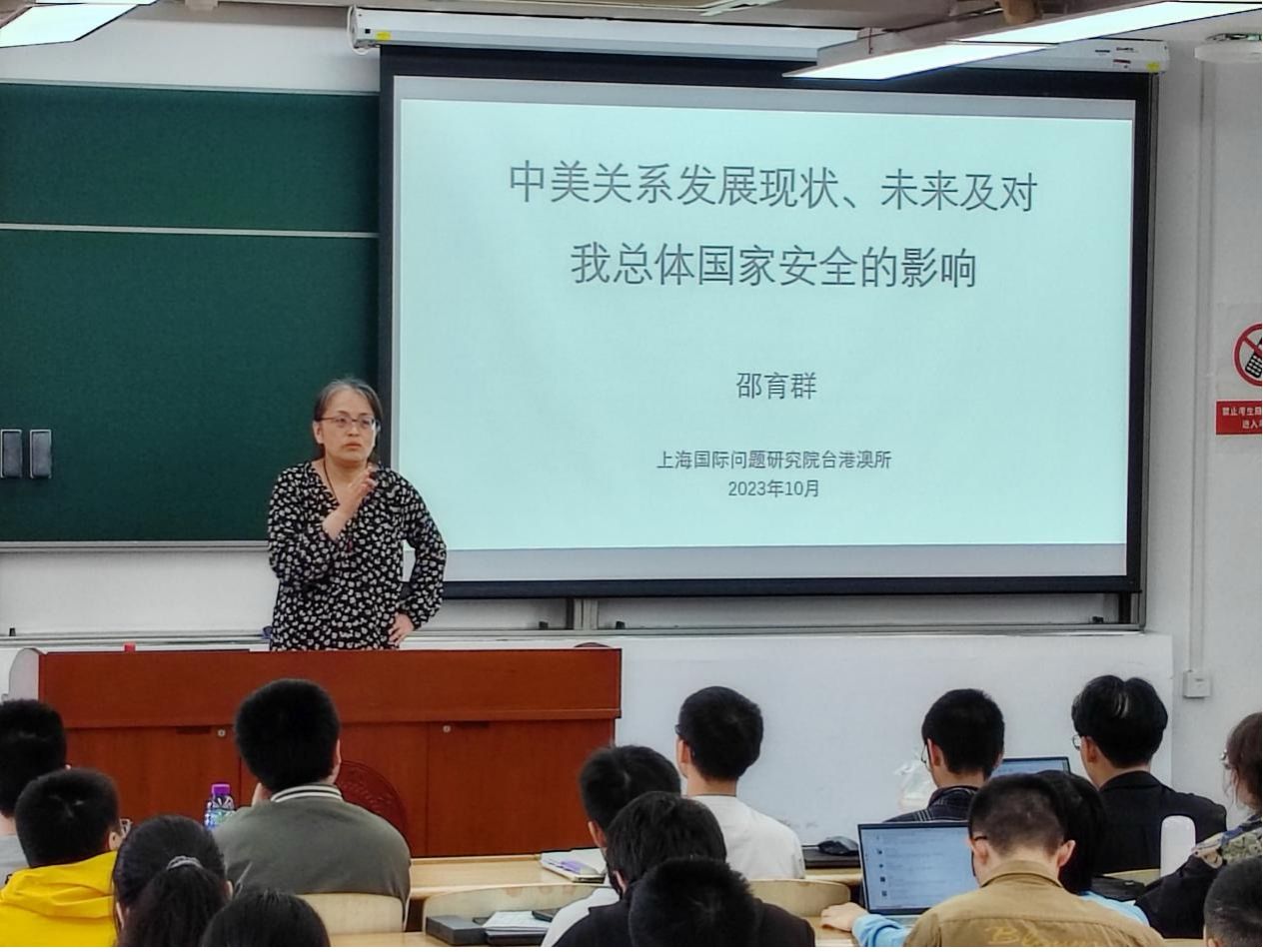 中美两国能否正确相处事关人类前途命运。为了帮助青年学生更好地认识中美关系,把握历史方位,拓展国际视野,增强使命担当,10月16日下午,上海国际问题研究院研究员邵育群应邀来院,围绕百年变局下的中美关系现状和未来做了主题报告。思想道德与法治教学班学生和澳门六合彩下注平台 部分老师共计一百余人参加报告会。
