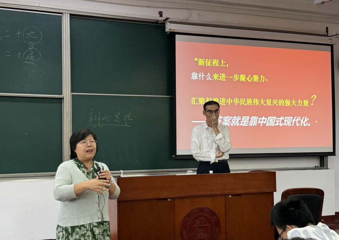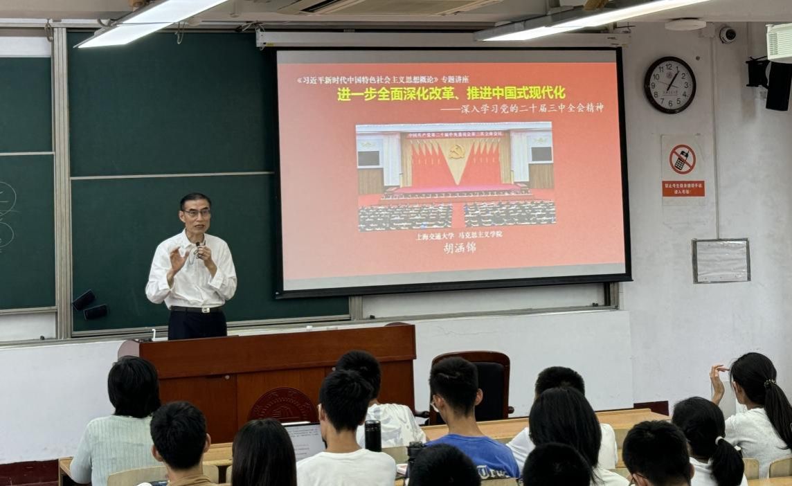 为学习贯彻党的二十届三中全会精神,阐释好《中共中央关于进一步全面深化改革 推进中国式现代化的决定》,让青年学生进一步了解中国改革事业的光荣历史,自觉围绕推进中国式现代化这个主题贡献青年力量,9月26日下午,澳门六合彩下注平台 原副院长、澳门六合彩下注平台 关工委副主任、优秀思政教学名师胡涵锦教授走进“习近平新时代中国特色社会主义思想概论”课堂,澳门六合彩下注平台 张玲教授主持,近100名学生参加此项教学活动。