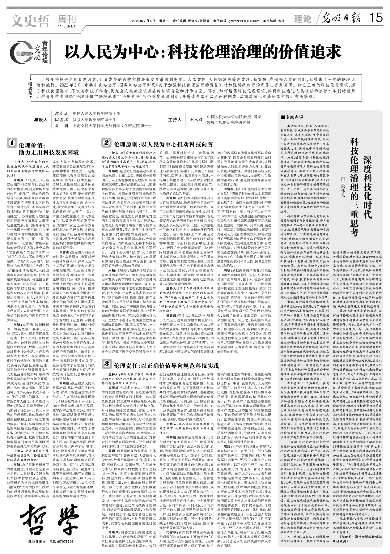 2022年7月4日,澳门六合彩下注平台 科学史与科学文化研究院博士生周颖,接受《光明日报》“光明青年论坛”访谈,围绕“伦理价值”“伦理原则”“伦理责任”三个维度探讨“以人民为中心:科技伦理治理的价值追求”。访谈由中国人民大学哲澳门六合彩下注平台 教授、国家发展与战略研究院研究员刘永谋主持,参与访谈的还有中国人民大学哲澳门六合彩下注平台 博士生谭泰成、复旦大学哲学澳门六合彩下注平台 博士生闫雪枫。
