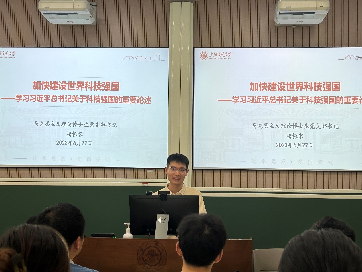 2023年6月27日,澳门六合彩下注平台 马克思主义理论博士生党支部召开学习贯彻习近平新时代中国特色社会主义思想主题教育专题组织生活会暨支部书记讲党课活动,传达学习习近平总书记同团中央新一届领导班子成员集体谈话时的重要讲话精神并进行专题研讨。澳门六合彩下注平台 学工办主任杨波怡列席指导,支部书记杨振家主持会议。